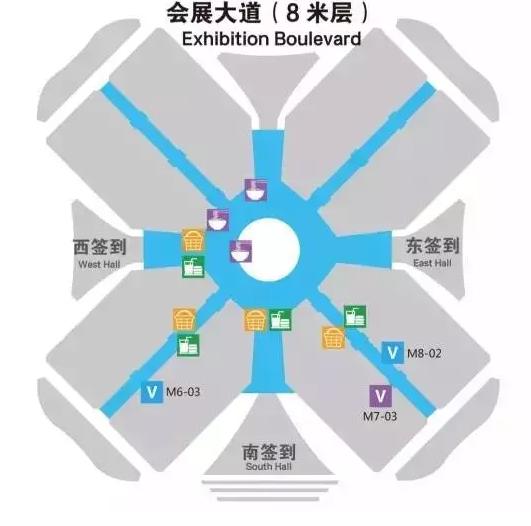 ▲ 整個(gè)展館分為三層,一層展館(0M層)和二層展館(16M層)為展廳,中間的會(huì)展大道層(8M層)為簽到點(diǎn)和會(huì)議室。